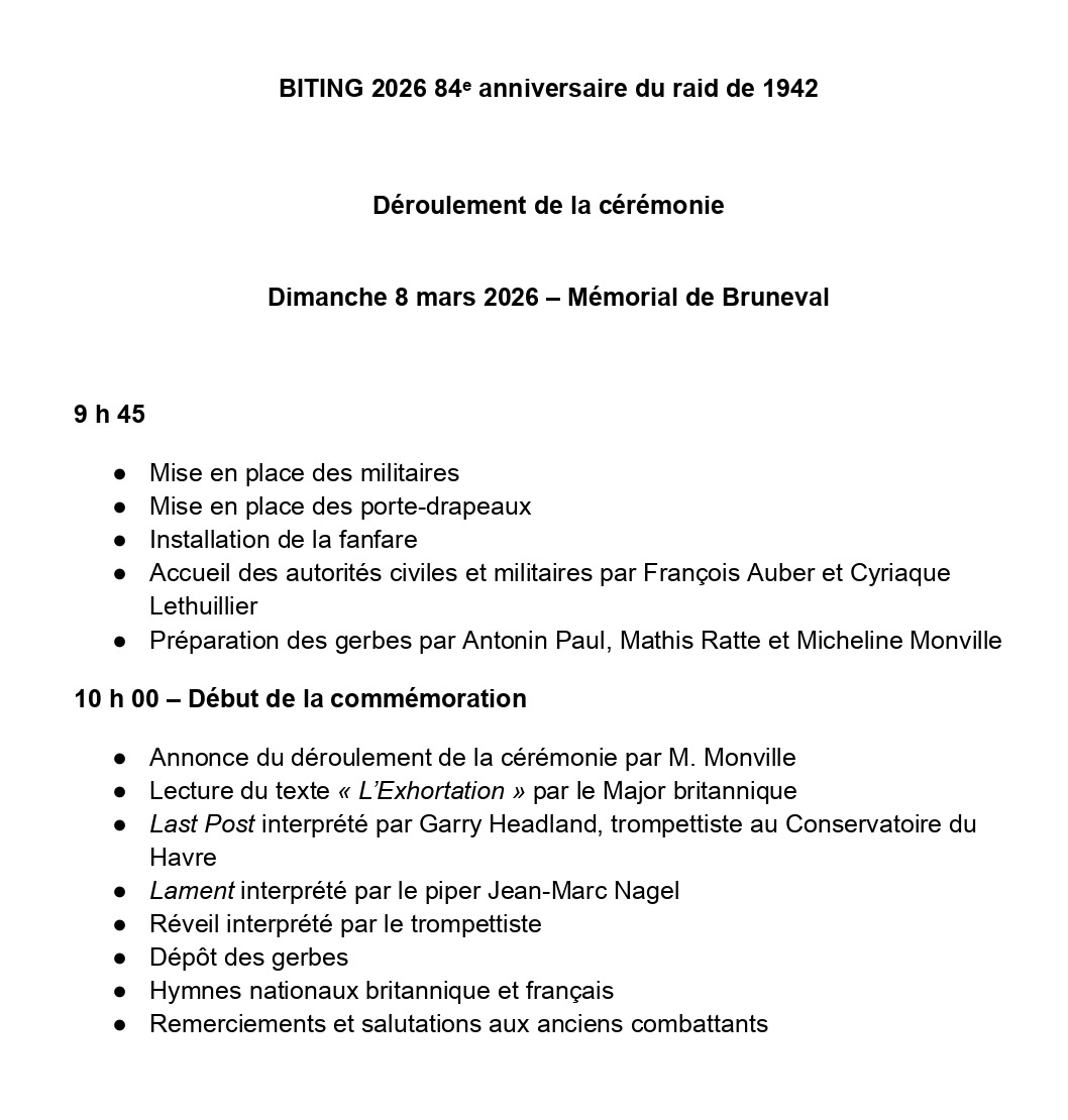 Dans le cadres des cérémonies du 84ème anniversaire du "Raid de Bruneval - Opération Biting" voici les dates et horaires des différentes commémorations :